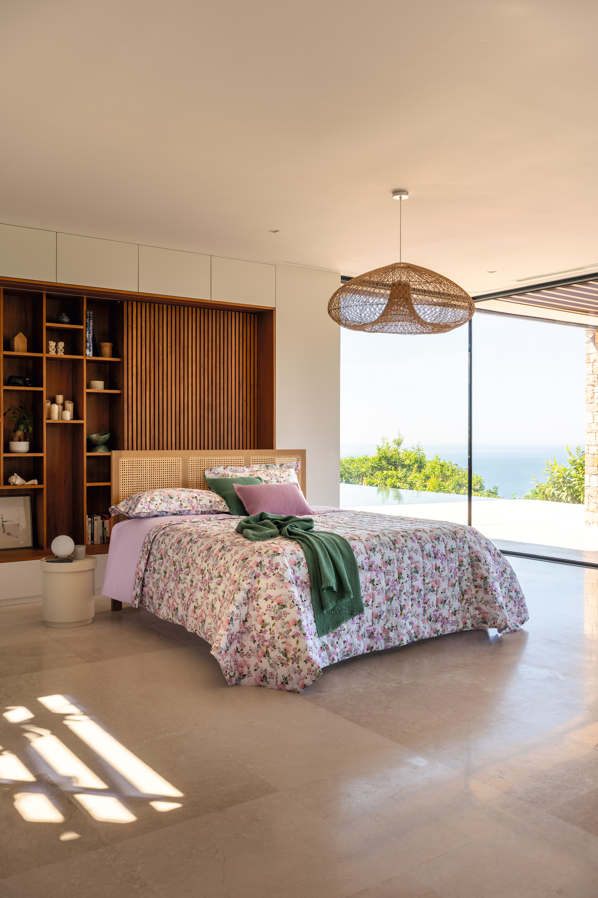 枕套以四邊荷葉邊設計,並配有滾邊,採用數位印花的純棉精梳布製成;其餘套件則為純色精梳棉材質。